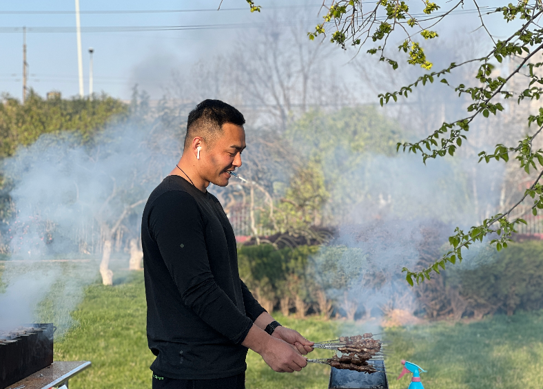 热闹的露天长桌,小伙伴们娴熟烤肉的身影,一把孜然抛洒,腾升的青袅,滋滋的烧烤声,抚慰着饥肠辘辘的我们。